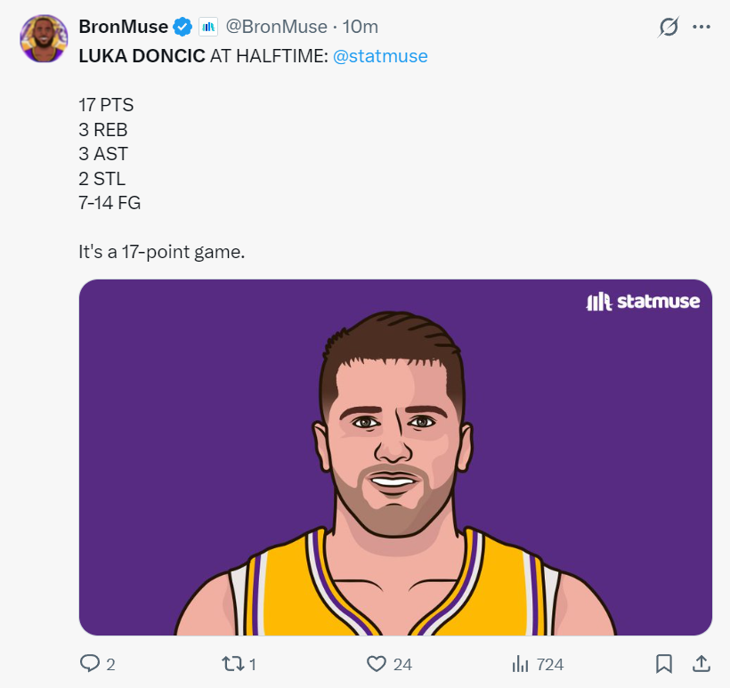 第三节东契奇连续打铁,艰难造犯规两罚全中,东契奇就连快攻的上篮都未能命中,湖人一度落后到26分,东契奇终于开始接管比赛,连续制造犯规后还命中一个三分球,只可惜下一个回合三分不中,三节打完东契奇22中9拿到26分8篮板7助攻3抢断仅1失误。